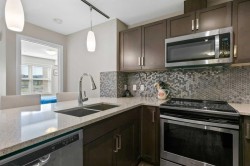 Welcome to The Chateaux! Airdrie's premier 40+ condo building in the wonderful community of Kings Heights. This complex offers sophistication, pride of ownership, and unbeatable proximity to all amenities. Upon entering this unit, you'll be impressed by the abundance of natural light, enhanced by its south-facing exposure. You're greeted by beautiful tile flooring that leads into a welcoming front entrance, where you'll find a spacious coat closet with built-in shelves, perfect for storing coats, keys and shoes. To your right is the kitchen, you will love not only the generous counter space but also the ample cabinetry this layout offers. The kitchen features granite countertops, a large sink, a lazy Susan in the corner cabinet, a garburator and a counter overhang for bar stool seating, ideal for casual meals. Stainless steel appliances and a well-appointed pantry with pull-out drawers complete this thoughtfully designed space. Moving into the living room, enjoy a spacious layout complemented by a beautiful custom California Closets media centre that is perfect for your TV, artwork and storage needs. Stay cool in the summer with a wall-mounted A/C unit. Your southwest-facing balcony offers year-round afternoon sun, making it the perfect place to enjoy your morning coffee, tea or an evening drink. This balcony was upgraded at the time of construction with glass panels and a gate, offering convenient direct access to the landscaped common areas, especially great for pet owners. The primary bedroom is a dream, with a large south-facing window and a spacious walk-through closet that leads into your ensuite bathroom. The ensuite features a walk-in shower with a built-in seat and elegant glass doors. The second bedroom is impressively sized and bright with custom built-in California Closet organizers that provide exceptional storage and organization. A second full bathroom is located just outside this room, complete with a beautiful vanity and a large bathtub. In-suite laundry is neatly tucked into a dedicated closet with room for storage and laundry supplies. This apartment also features a versatile den to the left of the front door that is ideal for a home office, additional storage or exercise space. For parking, enjoy the convenience of a titled underground stall located just steps from the elevator. In front of your stall, you’ll find a large, secure storage locker. Plus, there’s ample outdoor visitor parking for your guests. The Chateaux features a beautifully landscaped courtyard with a gas fireplace, and an amenity room available for private bookings where residents regularly gather here for social events and happy hours. There's also a secure underground workshop for woodworking enthusiasts. Located in Kings Heights, you’re within walking distance to Save-On-Food, Shoppers Drug Mart, banks, salons, restaurants and more meeting all your grocery, shopping, and healthcare needs. This building is truly designed for mature ownership & a vibrant, social community.