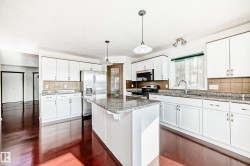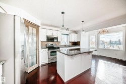Located in the highly desired community of Elsinore. Walk-out basement, lake backing, A/C and a second kitchen. Welcome to this stunning home featuring black stucco and stone exterior, exposed aggregate with stamp border driveway and heated triple garage. Step inside to a grand formal dining area that flows seamlessly into the open-concept kitchen, complete with a large island, breakfast nook surrounded by windows, and a spacious walk-in pantry. The inviting living room offers a cozy fireplace, perfect for relaxing evenings. Upstairs you’ll find three generous bedrooms, 2 full bath, including a beautiful primary suite with a luxurious ensuite featuring a soaker tub and separate standup shower. The fully finished basement offers incredible versatility with a second kitchen, additional living room, bedroom, and full bathroom, ideal for extended family or guests. Enjoy outdoor living on the large deck overlooking the lake and expansive backyard, perfect for entertaining or quiet nights taking in the view.