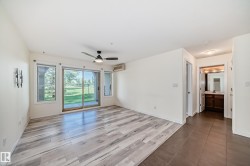 Welcome to The Lodge at Lewis Estates! This sought-after 30+ adult living complex feels like a mountain lodge retreat, complete with fitness centre, hot tub, steam room, party room, theatre, two rooftop patios, and a car wash — all just steps from the golf course. TIHIS UNIT FEATURES A RARE TITLED STORAGE UNIT! This main-floor condo offers 2 bedrooms and 2 bathrooms with a bright, open floor plan. The chef-inspired kitchen features Decorastone resurfaced granite countertops, abundant cabinetry, and a large island. The spacious bedrooms are separated by the living room, which opens to a west-facing covered patio with park views — the ideal spot to enjoy warm summer evenings. Highlights include a 3-pc main bath, 4-pc ensuite, in-floor heating, in-suite laundry, and storage. Complete with A titled parking stall very close to the elevators. Cats, birds & fish permitted with board approval (sorry, no dogs). Conveniently located near Transit, shopping, WEM, and with easy access to the Anthony Henday.