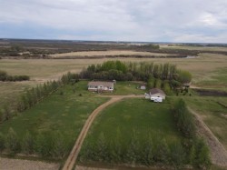 A charming 2008 - 1760 sq ft bungalow sits on a 6-acre lot with views of the South Heart River, offering the perfect blend of rural tranquillity and modern comfort. The home features three bedrooms and two bathrooms, which includes a light-filled ensuite with a luxurious four-piece bathroom complete with a stand-up shower and a deep soaker tub—ideal for unwinding after a long day. The open-concept kitchen and dining area are bathed in soft natural light from northeast-facing windows, eliminating harsh glare while creating a warm and inviting atmosphere. Convenient main-floor laundry makes everyday living effortless. Downstairs, the full basement is already wired and framed for future expansion, offering the potential for two additional bedrooms, a bathroom, and a family room—perfect for growing families or hosting guests. Outside, the property includes a detached three-car garage with a cement apron, a sturdy dog house, and a large dog run for pet owners. With central air conditioning ensuring year-round comfort and a peaceful location just 10 km from High Prairie, this home is a rare find for those seeking space, serenity, and endless possibilities.