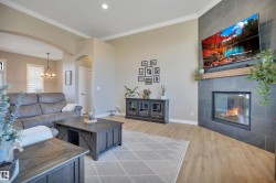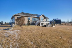 Welcome home to this beautifully upgraded walkout bungalow set on 3.29 fully fenced acres. Inside, you’ll find striking 12-ft ceilings in the living room, a gas fireplace, and expansive west-facing windows that fill the space with natural light. The upgraded kitchen offers quartz countertops, newer Bosch appliances, abundant storage, and generous workspace. The spacious primary suite features a luxurious ensuite with double sinks, a large soaker tub, separate shower, and walk-in closet. Two additional bedrooms, a full bath, main floor laundry, and a large mudroom complete the main level. The walkout basement offers a massive rec room, a bedroom with walk-in closet, full bath, office, and an additional bedroom ready for your finishing touches. Enjoy a heated triple garage, central A/C, dog wash and run, and a sunny west-facing yard—fully fenced and horse-ready—with a hot tub! Just 8 minutes from the heart Beaumont and right down the road from Eagle Rock Golf Course, this is acreage living at its finest!!!
