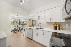 Renovation! Renovation! Renovation! This 2 bed, 2 bath unit is in Evergreen Village—one of Abbotsford’s best managed 55+ communities. Concrete construction makes this home quiet and solid! Enjoy a spacious open-concept layout with a deluxe chef’s kitchen, quartz counters, custom cabinetry, new stainless appliances, laminate flooring, A/C, and spa-like baths. Includes in-suite laundry and a versatile office/storage room. The building offers top-tier amenities: indoor pool, hot tub, workshop, library, hobby/recreation rooms, RV parking, guest suit and secured underground parking. Prime location with a bus stop out front and all essentials nearby. Call Today!