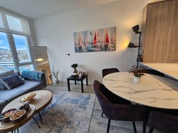 Wake up to beautiful mountain and city views from this exceptional 1 Bed + Den suite at Alpha at Lumina, perfectly situated in Brentwood's core. Step into a sleek, chef-ready kitchen featuring a premium Miele appliance package, gas cooking, and elegant quartz counters. Enjoy year-round comfort thanks to in-suite A/C. The building is fully loaded with premium amenities including concierge service, a fully equipped gym, exclusive outdoor greenspace, and convenient EV charging. The location is unbeatable: you're steps from the revamped Brentwood Mall and just a short stroll to the Skytrain, Costco, Whole Foods, and endless dining choices.