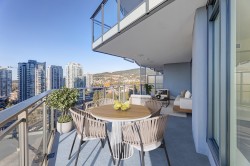 Enjoy stylish living in this bright southwest corner unit at Sophora at the Park by Polygon! This 2-year new 2 bed, 2 bath home features 861 SF inside plus 2 generous balconies totaling 376 SF. The sunny south-facing living space offers wide-open views, while the gourmet kitchen boasts Bosch appliances and a sleek central island. The primary bedroom includes double closets and a modern ensuite. The second bedroom sits privately on the opposite side with its own balcony. West-facing covered patio offers stunning city views. A/C and laminate flooring throughout. Exceptional amenities: gym, yoga studio, games/party room, rooftop garden and more. Walk to SkyTrain, Coquitlam Centre, restaurants, library, and top schools. 1 parking & 1 locker included.