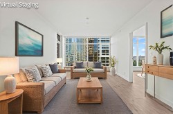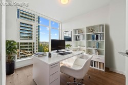 Brand new SOUTH-facing 2 BDRM corner home at Smith & Farrow by Boffo. Enjoy abundant natural light and a spacious 233 sqft patio with gas hookup. Features include A/C with smart thermostat, choice of designer dining table or 6' quartz island, integrated Fisher & Paykel/Bosch appliances, 5-burner gas cooktop, French door fridge, and custom pantry wall. Primary BDRM offers built-in wardrobe, heated ensuite floors, frameless glass shower, and medicine cabinets. Second bath with soaker tub, full-size laundry. Resort-style amenities: rooftop lounge, pool, hot tub, steam rooms & gym. 1parking + storage. Move-in ready! OPEN HOUSE Nov 1 2-4PM