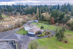 Set on 4.43 private acres backing onto the Salmon River, this property combines natural beautify with everyday convenience. The well-kept home features a spacious primary bedroom on the main with ensuite, walk-in closet, and private patio access, plus formal living and dining rooms and a bright sunroom that captures the surrounded greenery. The land offers space for a hobby farm and a large graveled area ideal for parking or storage, with zoning allowing up to three commercial vehicles (max 5,600 kg each), and an outbuilding with power. Just 5 minutes to Fort Langley and minutes to Walnut Grove's shops, dining, recreation, and Hwy 1.