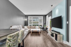 Spacious and bright ground-level end unit offering 2 bedrooms, 2 bathrooms, and 2 parking spots. This well-maintained home features an open-concept layout with oversized windows filling the space with natural light. The modern kitchen is equipped with quartz countertops, stainless steel appliances, and ample cabinetry. Primary bedroom includes a walk-through closet and private ensuite. Enjoy a large patio with convenient access, perfect for outdoor living. Located in a well-managed complex within walking distance to shopping, Costco, restaurants, transit, and recreation.