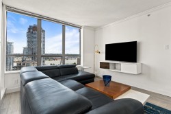 NEW PRICE! FRESHLY PAINTED+INSPECTION REPORT INCLUDED. Stunning views, floor-to-ceiling windows, south facing sunshine await in this 2021 renovated ($55K) 2-bedroom PLUS DEN/3RD BR corner home with the most desirable floor plan in the building. Wide plank flooring, brushed gold fixtures, gloss white cabinets, stainless/ white appliances, barn sink, & custom Italian tile backsplash. Breathtaking views of the Fraser River enjoyed year-round from inside or on your spacious balcony that extends the living area in the warmer months. Primary BR includes a river-view and renovated ensuite. Additional BR and den/BR share a stylish 3-piece bath and mountain views. Steps to New West Skytrain station, Quay, shopping/groceries, restaurants, & convenience right at your door.