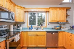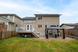 Soaring ceilings and West Coast contemporary design welcome you to this bright, spacious home. Clerestory windows fill the open living and dining areas with light, and garden doors lead to a sundeck and large fenced backyard with interlocking brick patio. The main-floor primary bedroom features a walk-in closet, 4-piece cheater ensuite, and nearby laundry. Upstairs offers two bedrooms with walk-in closets and a full bath; the lower level includes a large rec room, extra bedroom, bath, and flex space. Central air conditioning. 200 AMP in garage, Updates include a new roof, hot water tank, and furnace. Double garage and fantastic location!