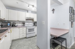 WELCOME to Cardinal Court! BIG 01 BED, 02 BATH unit with 01 under ground parking, Bedroom with luxury ensuite, dining area, beautiful bright corner unit with outdoor area. BONUS : Gas fireplace and Heat included in strata fees. EXCELLENT location, walk to major shopping like Superstore, Save On Foods, Restaurants, transportation and recreation center (new wave pool), Library, parks and much more.