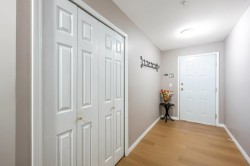 Enjoy this immaculate 1,367 sqft rancher like, WHEELCHAIR ACCESSIBLE Strawberry Hill condo. This SOUTH FACING 2 bedroom, 2 bath, freshly painted, centrally located condo is move-in ready. It features a large airy living room w/ crown moulding, big windows & plenty of natural light, in floor radiant heat & 2 natural gas fireplaces. The kitchen is equipped w/ ample counter & cupboard space, white appliances & adjacent nook. The primary bedroom is large enough for all your furniture & the ensuite is a fully walk in bathroom & shower. The walkout garden patio extends your living space, perfect for your green thumb. For your convenience, it has its own in suite laundry, storage & TWO PARKING STALLS. Enjoy the proximity to schools, daycare, transit, library, shopping, temples, Hwy 10 & Bridges.