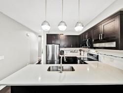 Former show home at Teo by the Creek. This 3 bed / 3 bath townhome faces a protected greenbelt and is situated on the quiet side of the complex. Features include a powder room on the main floor, quartz countertops throughout, soft-close shaker cabinets, stainless steel appliances, and a front-facing balcony. Walk out to a private yard directly from the living room. Freshly painted and well maintained. Convenient location near schools, shopping, transit, and recreation.