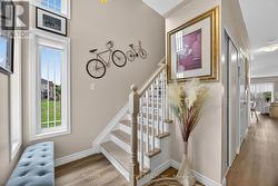 Meticulously maintained this end unit sits on a premium size lot with a walk out basement. One of the largest units in the complex offering 1427 sq ft above ground and an abundance of natural light. Freshly painted upstairs and down, with new uniform flooring throughout main level, this home is turn key. Good size bright living room with walk out to a deck. Kitchen has oodles of cupboards, new counter, sink and tap. Dining area offers space for entertaining and family dining. Powder room has a new vanity. Inside entry from the spotless garage. Basement level is incredibly bright with a walkout and full size window and rough in plumbing. 2nd floor, bright with an amazing size primary bedroom featuring a walk through closet to a full 4 piece ensuite. The other 2 bedrooms are spacious and bright with city and partial water views. 4 piece bath and upper level laundry room finish the 2nd floor layout. Great south location with public transit and close proximity to the Allandale "GO" station. Walking distance to shopping, waterfront trails and restaurants. This home is a must see to appreciate the pride in ownership and living space offered. (id:27)