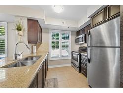 Welcome to this bright and spacious 1 bedroom + den, 1 bathroom corner unit offering 720 sq.ft. of open-concept living on the main floor with a wrap-around patio. Featuring hardwood flooring through the main living areas, a kitchen with stainless steel appliances, quartz countertops, and a breakfast bar. The open living and dining area is filled with natural light from a wall of windows with California shutters. The den provides an ideal space for a home office, while the large primary bedroom offers comfort and functionality. Enjoy the convenience of in-suite laundry, underground parking, and a locker. The private patio is perfect for relaxing or entertaining. Ideally located within walking distance to public transit, schools, parks, restaurants, and shopping, with quick access to major highways for easy commuting.