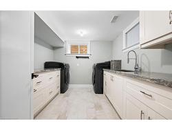 Stunning custom home on a 63' x 136' lot in downtown Burlington. Professionally landscaped yard with heated pool and detached year-round living space, ideal as a nanny suite, office, or guest house—includes kitchenette, 3-pc bath, and cozy lounge. Inside features coffered ceilings, 8" hand-scribed hardwood, custom millwork, and gourmet kitchen with quartz counters, bold blue island, premium appliances, and coffee bar. French doors open to a covered deck with sunken hot tub. Family room with wood-burning fireplace. Luxurious primary suite with spa-like ensuite and custom dressing room. Three additional bedrooms and stylish 4-pc bath upstairs. Finished lower level with rec room, 2-pc bath, and laundry/wet bar with granite and full-size fridge.