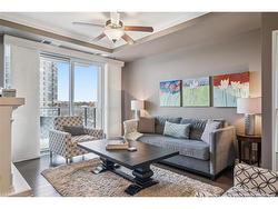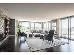 Welcome to RiverHouse, one of downtown Guelph's most sought-after condominium residences. This stylish turnkey suite pairs luxury finishes with an urban lifestyle just steps from the GO station, Sleeman Centre, Speed River and the city's best shops, dining, and downtown amenities. Inside, the open-concept layout is bright and inviting, with large windows and a private balcony showcasing panoramic city views. The kitchen features rich espresso cabinetry, granite countertops, stainless steel appliances, and an island with bar seating that flows seamlessly into the living and dining area. The living room offers elegant crown moulding, a fireplace feature, and sliding doors to the balcony - an ideal space for morning coffee or relaxing above the city. Both bedrooms are generously sized, with the primary suite offering floor-to-ceiling windows, a walk-in closet, and a spa-like ensuite with a glass-enclosed shower and stone vanity. A second full bathroom with a frameless glass shower serves guests and the secondary bedroom. Additional highlights include in-suite laundry, 2 underground parking spaces with an EV rough-in set up for future installation and a storage locker. RiverHouse provides a refined lifestyle with amenities such as a fitness centre, party room equipped with a bar/lounge, large outdoor terrace, and guest suite, all within a secure and well-managed building. A rare opportunity to experience upscale condominium living in the heart of Guelph's vibrant downtown core. All furniture can be purchased, see realtor remarks for further details.