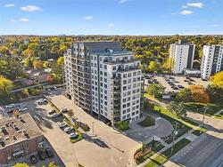 Located in Belmont Village Condominiums, this 8th floor unit offers care-free living in a beautiful, well-kept building. Step inside the unit and appreciate the built-in cabinetry and large coat closet. Spacious open-concept kitchen/dining room/living room layout with updated luxury wide-plank flooring in the main living space and both bedrooms. Ceramic tile in the foyer, laundry room and both bathrooms. Freshly painted throughout, this unit shows so well and is truly move-in ready. The laundry room has a new stackable washer/dryer set (2024) plus room for a second fridge and extra storage space. The white kitchen has new stainless fridge, stove and microwave, granite counters, an island with extra prep space and plenty of storage. This corner unit is bright with lots of natural light and 180 degree views of the city. The primary bedroom is large and has a walk-in closet and primary bathroom with double sinks and walk-in shower. One underground parking space that is close to the building entrance plus lots of visitor parking outside. Building amenities include: party room, media room, exercise room, games room, guest suite, community BBQ on the patio. Condo fees include heat, air conditioning and water. Centrally located and walkable to all the shops and restaurants in Belmont Village, the Iron Horse trail, and quick access to Uptown Waterloo or Downtown Kitchener.