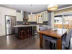 Welcome to this executive 4-bedroom, 4-bathroom detached 2-storey home, built in 2016 and located in the prestigious Fernwood Estates subdivision in Niagara Falls. Step inside to find rich, dark hardwood flooring throughout both the main and second floors, with no broadloom anywhere in the home. Nine-foot smooth ceilings and pot lights on the main level create a bright, upscale feel, while the impressive open-to-above foyer sets the tone for the rest of the home. The gourmet kitchen is a chef's dream, featuring granite countertops, a stylish backsplash, a breakfast bar, and stainless steel appliances. Porcelain tiles highlight the foyer and spacious laundry room, which also provides a walkout to the double-car garage. Upstairs, the large primary suite offers a luxurious 5-piece ensuite bath and a walk-in closet. Three additional well-sized bedrooms share a third 4-piece bathroom. The finished lower level, accessible via a separate walk-up through the garage, offers vinyl flooring, a large recreation/family room, a potential fifth bedroom, a full 3-piece bathroom, and a cold room for extra storage. The exterior is equally impressive, featuring a stone and stucco finish, an exposed aggregate driveway with parking for four vehicles, and a covered concrete patio ideal for outdoor entertaining. Built with style and functionality in mind, this 2016 home combines elegance, comfort, and premium finishes throughout.