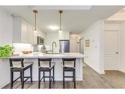 Stunning 2 bed, 2 bath suite in the heart of Kerr Village. With over 900 square feet of thoughtfully designed living space, this top-floor unit in an exclusive 4-storey low-rise building is a rare find. The open-concept living space features 9-foot ceilings, wide-plank hardwood floors, and crown molding throughout, creating a bright and sophisticated atmosphere. The gourmet kitchen boasts premium white cabinetry, quartz countertops with waterfall edges, hidden pantry a full suite of stainless steel appliances, and elegant pendant lighting over a spacious breakfast bar. The adjacent living and dining area is both stylish and functional, with large windows that fill the space with natural light and provide a seamless flow out to the private balcony. Enjoy morning coffee or unwind in the evening surrounded by lush greenery and serene views.The primary bedroom offers a tranquil retreat with custom built-in wardrobes, ample closet space, and a calming neutral palette. A versatile second bedroom can serve as a guest room or home office, complete with mirrored storage and a built-in workspace. The bathrooms feature refined finishes including marble-look tile, modern vanities, gold hardware, and designer lighting.Additional highlights include in-suite laundry, upgraded lighting fixtures, and thoughtful storage solutions throughout. The furnace has been recently serviced and is in good working order, adding peace of mind. The suite includes in-unit laundry, a tandem two parking spot on P1 for two cars, and a private storage locker. Step outside and you're moments from multi-million dollar homes, the tranquil shores of Lake Ontario, vibrant Kerr Street, and downtown Oakville. Enjoy the serenity of nearby green spaces like Tannery Park and 16 Mile Creek, while staying connected with quick access to Oakville GO Station and major highways. You will love calling this home.