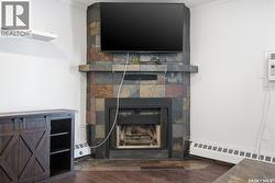 Welcome to a truly rare opportunity in The Gardens. This stunning, completely renovated top-floor corner unit offers 1,066 sqft of sophisticated living space, unlike anything else on the market at this price point. Step inside to find gleaming white ceramic tile flowing through the entry, laundry, and dining areas. The heart of the home is the showpiece kitchen, fully remodeled with high-gloss white cabinetry, granite countertops, a sprawling eat-up island, and sleek black stainless steel appliances. Enhanced by custom Lutron lighting, this space opens to a spacious dining area perfect for hosting, and a cozy den tucked just off the kitchen. The living room is designed for relaxation, featuring rich hardwood floors, a corner wood-burning fireplace framed by custom stone tiling, and patio doors leading to a covered deck with serene views of Wascana Lake. The unit offers two generous bedrooms, including a master suite with a custom closet organizer and a convenient 2-piece ensuite. Both bathrooms have been meticulously updated, with the main 4-piece bath showcasing a custom shower and impressive tile work. Practicality meets luxury with a massive laundry room offering freezer space, plus an additional in-suite storage closet. Located just steps from the walking paths of Wascana Park, the U of R, and Sask Polytechnic, this condo is perfectly positioned for an active lifestyle. Note: An additional parking stall may be available for rent if required. (id:27)
