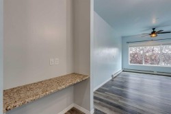 Incredible value in this beautifully updated 2-bedroom suite overlooking a serene, tree-covered courtyard. This sought-after floorplan features numerous upgrades, including modern ceiling fans and light fixtures, custom closets in the primary bedroom, freshly painted ceilings in the main living area, luxury vinyl plank flooring, and custom window blinds throughout.The stylish kitchen showcases granite countertops, a raised breakfast bar, and newer stainless steel appliances, all flowing seamlessly into the dining area, living room, and a convenient office nook. The bright and inviting living room offers access to the first of two spacious balconies—perfect for relaxing or entertaining.Ideal for families, roommates, or anyone seeking privacy, the two bedrooms are thoughtfully separated. The generous primary suite includes its own ensuite, while the second bedroom enjoys access to the second large, private balcony and is just steps away from the full main bathroom.This home includes two parking stalls (one titled and one assigned) plus an assigned storage locker. Walking distance to shops, restaurants, and everyday conveniences.A fantastic opportunity—shows beautifully!