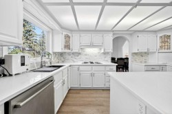 Welcome to this elegant home with a durable clay tile roof, offering over 4,000 sq. ft. of developed living space with 4+1 Bedrooms and 3.5 Baths. Set apart by its soaring spaces and thoughtful design, this home is perfect for a growing family, balancing comfort with style across its multiple levels for everyday living and entertaining.The main floor greets you with a 17’ high ceiling foyer and a graceful spiral staircase. To the right, the sunny south-facing Living Room and formal Dining Room share an 11’7” vaulted ceiling and gleaming hardwood flooring, creating a warm and inviting atmosphere that easily fits an 8-person dining table. The bright white Kitchen features a centre island with quartz countertops, ample cabinets, and a pantry, seamlessly connecting to the Breakfast Nook with access to the large 17’ x 10’8” Deck with gas hookup, perfect for morning coffee or relaxing evenings outdoors. A spacious Family Room with built-in bookshelves, a wood-burning fireplace, and large windows is perfect for gatherings. A private Den with French doors, Powder Room, and Laundry with sink complete this level.On the upper level, the spacious Primary Bedroom includes a cozy seating area with distant views of downtown, and a luxurious 5-pc Ensuite featuring a double vanity, jetted tub, and walk-in closet. Three additional Bedrooms and a full Bath with double vanity provide ample space for family.The fully finished walkout basement boasts higher ceilings and a massive Recreation Room with built-in shelves, a sink, and a gas fireplace. This versatile area can easily be divided into two separate spaces—currently set up as a gym and a family lounge. A good sized Bedroom and 4-pc Bath complete this level. Step out to the covered patio and landscaped backyard, with a concrete pathway leading to the front yard and the oversized double attached garage.Located in the desirable Shawnee Slopes community, this home is steps from Fish Creek Provincial Park and close to top-rated schools. Residents can also enjoy the Millrise Outdoor Rink during winter, perfect for skating and community events. Easy access to Shawnessy Shopping District and convenient transit options complete this safe and welcoming neighborhood.