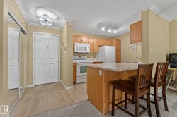 TOP FLOOR, SOUTH-FACING 1 bedroom unit in Grande Whitemud! This bright and spacious condo features NEW flooring (Carpet/Laminate 2025) and NEW fresh paint throughout (2025), a cozy GAS FIEPLACE, and south-facing balcony over-looking the court yard with natural gas BBQ hook-up. Functional layout with in-suite laundry and storage room. Enjoy the convenience of the underground titled HEATED PARKING with a storage cage directly in front of the stall. The building offers amenities including a social/party room and fitness room. Ideal location close to restaurants, shopping, and quick access to transit—with a bus stop right outside the building. Easy access to whitemud and A Henday. The building comes equipped with access doors and an elevator, ideal for those with mobility issues. Perfect for first-time buyers, students, or investors!