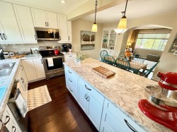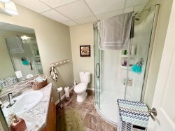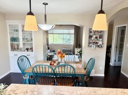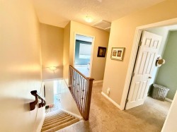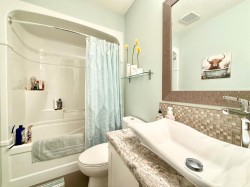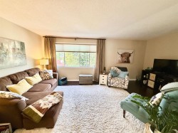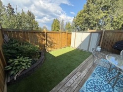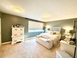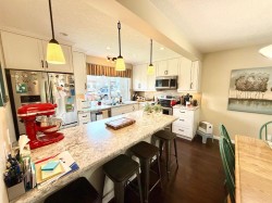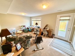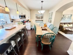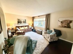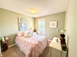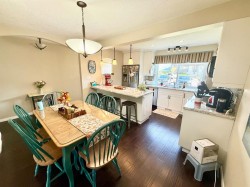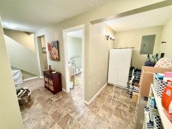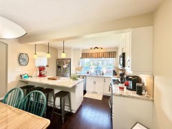 This beautifully renovated condo offers a unique open-concept layout with style and functionality throughout. The bright white kitchen features stainless steel appliances, a central island, and plenty of cabinetry, seamlessly flowing into the dining area and living room, all finished with rich engineered hardwood flooring. Upstairs, you'll find three generous bedrooms and a renovated 4 piece bathroom complete with a soaker tub. The fully finished walk out basement adds even more living space, featuring a large family room, a convenient 3 piece bathroom, laundry area, and direct access to the private back patio with maintenance free lawn and storage shed. This home includes 2 powered parking stalls right out front for your convenience. Ideally located close to walking trails, schools, and all amenities, this Carriage Lane gem is move in ready and waiting for you!