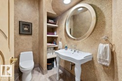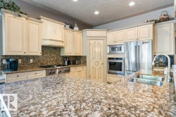 Located KINGSFORD CRESCENT ON A QUIET CUL-DE -SAC this custom built 4-bedroom 2000sqft great room bungalow with OVERSIZED TRIPLE CAR garage features over 3700SQFT OF AWESOME LIVING SPACE. From is stamped concrete driveway to its stunning stone exterior this home is impressive. Upon entering you are greeted by stunning custom millwork, hand scraped hardwood flooring, a main floor office/dining room and an expansive view of the great room with huge family room & feature wall fireplace, STUNNING GRANITE KITCHEN WITH ANTIQUED CABINETS, breakfast bar island, gas stove, built in ovens, pantry, S/S appliances, beverage fridge, loads of counterspace & a sundrenched dining nook. Additional features include: huge master bedroom with 6 pc ensuite, 2 person jacuzzi tub, glass block shower & walk in closet, HUGE RECREATION ROOM with feature wall fireplace, 3 additional large bedrooms, built in entertainment center, wet bar, games area, large laundry room, 9 foot ceilings, private patio all steps from RIVER LOT 56.