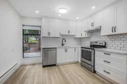 This renovated townhouse feels like a detached house! The location can't be beat- located across the street from WJ Mouat Secondary school! This home has a fenced yard and large patio. Inside, no expense has been spared in updating the home. Check out the bright kitchen with quartz countertops, custom cabinets, and stainless steel appliances. The spacious living and dining rooms overlook the quiet patio that's perfect for entertaining. A bathroom and storage room complete this level. Upstairs, there are 3 bedrooms, a large laundry room, and a gorgeous bathroom with a walk in shower and marble surround-it feels like a hotel! There's even a private sun deck off the primary bedroom. Other great features include many led pot lights and new flooring throughout.