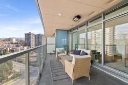 Beautifully designed North facing condo with open floor plan, high ceilings and floor to ceiling windows. Modern luxury with an abundance of thoughtful features and amenities. The kitchen is equipped w/stainless steel Bosh gas stove and appliances, ample storage w/built-ins, pull outs and soft close cabinets. Access to the 200SF heated & covered patio from both the living area and the bedroom. California style closets with LED lighting. Smart thermostat. A/C. Shaded roller blinds throughout. Bright and modern bathroom w/storage in the vanity. 1 parking w/EV charger and 1 large locker #888. Amenities include, gym, karaoke lounge, pingpong, pool table, indoor&outdoor lounges, study, touchless carwash and more! Minutes to Amazing Brentwood Mall, transit and all the necessities.