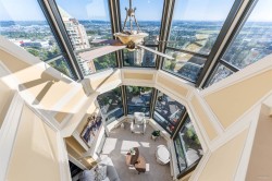 Architectural Masterpiece: Classy loft-style Penthouse at the desirable City in the Park! Surrounded by Byrne Creek Park & manicured European gardens, this luxurious gallery-inspired residence offers 3BR/3BA, 4 balconies & 3 parkings, w/ forever-protected breathtaking panoramic views of the city, park & water. Tastefully renovated by a renowned Italian builder w/ Roman-style architectural refinement, this home is filled w/ natural light streaming thru soaring ceilings, while cross-breezes enhance its airy elegance. Upgrades include a brand-new kitchen, motor blinds & custom closets. Steps to Edmonds SkyTrain; 5 star resort-style amenities: pool, steam/hottub, guest suite, theatre, clubhouse & fitness centre. Taylor Park Elementary & Byrne Creek Secondary catchment.