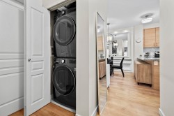 This STUNNING former "Show Home" is MOVE IN READY!! The "Thomas house" built by Polygon is a 2 bed/2 bath ground floor home featuring upgrades throughout: sophisticated built-ins, natural wood highlights, designer wallpaper, large framed mirrors, custom designed headboard featuring built-in side tables with lights, new flooring and more! BONUS: 9' ceiling, gas stove, storage locker, EV charging, LARGE patio w/ fenced yard - perfect for pets/kids! Residents also have access to the private Nakoma Clubhouse, which features over 18,000 sq. ft. of resort-style amenities: basketball/badminton court, outdoor pool, gym, guest suites, & yoga area.