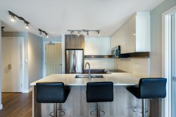 LOCATION! LOCATION! LOCATION! Walkable to everything, this 770 sqft 2-bedroom home at The Austin offers style, comfort, and convenience. Enjoy high-end finishings throughout with a spacious, open layout featuring floor-to-ceiling windows, a bright living room with access to a private patio, and a CHEF-INSPIRED kitchen with quartz counters, stainless steel appliances, double undermount sink, and breakfast bar seating for three. Two good-sized bedrooms are on opposite sides of the home, with a 4-piece cheater ensuite off the primary. Fantastic amenities include guest suites, lounge, gym/yoga room, children’s playground, and a large shared patio area. RARE BONUS: 2 side-by-side parking stalls + 1 storage locker. Rentals and pets allowed.