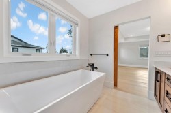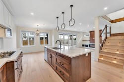 This stunning property offers a perfect blend of comfort and elegance, ideal for modern family living and a bonus mortgage helper if wanted. The spacious family room features bi-fold doors opening to a covered patio with a gas hookup, perfect for entertaining. The gourmet kitchen boasts Fisher Paykel appliances, a gas cooktop with a pot filler, and a walk-in pantry. The main floor also includes a guest bedroom and bathroom. The primary bed features a large walk-in closet and a spa-like ensuite with dual vanity, steam shower, and soaker tub. Upstairs, enjoy a spacious balcony with a gas hookup and water line. The third floor has a huge rec room with vaulted ceilings and an additional full bath. Includes A/C, HRV, radiant in-floor heating, and more.