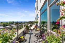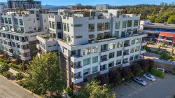 Sub Penthouse in Esquimalt Town Square! A charming and vibrant community offering the perfect blend of modern living and walkable amenities. This 1 bedroom plus den, luxury condo, offers oversized picture windows with mountain, city and ocean views from the 217 sq ft balcony! 9'7" ceilings, reclaimed brick feature wall, and modern electric fireplace. Oak flooring and Oak shelving in living room, closets and den/office. Bosch oven, gas range (gas included in strata fee), Fisher Paykel fridge, and custom cabinetry. Spacious bath with soaker tub and geothermal heated flooring. Gas BBQ hookup. Secure underground parking spot with EV charger. Live right beside the public library, ERC coffee, Saxe Point Pub, Esquimalt Rec Center with lap lanes, sauna, hot tub & steam room, 2 grocery stores within 5 minutes & Saxe Point just a walk away. Exceptionally maintained building! Low strata fees. Call now to book your viewing!