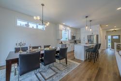 This detached, 2-bedroom main floor entry rancher with a basement offers the perfect combination of charm and functionality. As you come to the front door, there is a cozy porch that welcomes you. The bright, open main floor features a stunning shiplap fireplace, seamlessly connecting to the modern kitchen with a large island, quartz countertops, tile backsplash, and an attached dining area that leads to the back patio and fenced, grassed yard, perfect for outdoor entertaining. The primary bedroom boasts a walk-in closet, a luxurious 4-piece ensuite, and French doors that open onto a small patio with direct access to the yard, creating a private outdoor retreat. A second bedroom and a laundry room complete the main floor. The unfinished basement provides endless potential for customization, allowing a family to create their ideal space. Sitting on a corner lot, this home includes a 2-car garage and 2-car driveway, ensuring plenty of parking. Conveniently located near coffee shops, shopping, dining, and just minutes away from scenic recreation trails, this property is an excellent opportunity to enjoy modern living in a prime location. All measurements approx.