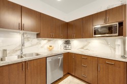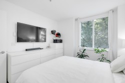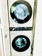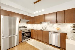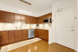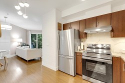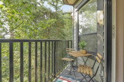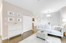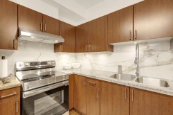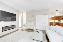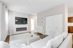 GREAT HOME, INCREDIBLE PRICE! Modern, contemporary one bedroom plus den that is used as a 2nd bdrm. 9' ceiling, open layout with a European flair, a gourmet kitchen & spa like bath w/ top of the line finishings. Beautiful LVG w/ accent wall, electric fireplace & TV, fresh paint, blinds & light fixtures. Dining w/ wainscoting, KITCHEN w/ new backsplash, granite countertops & brand new S/s appliances. Laminate flooring, & closet organizers. 'Mysa' smart thermostats in all rooms. New LG washer & dryer & so much more to list. South facing, situated beside a beautiful greenbelt, close to transit, restaurants & recreation center. Only 5 min away from 'Willowbrook Mall'. A must see!