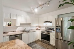 Welcome to River Gardens! This stunning 1,178 sq ft 2 bed + den, 2 bath home has been freshly painted and features elegant LVP flooring throughout. The bright kitchen offers ample white cabinetry, generous counter space, newer stainless appliances, & a pass-through eating bar to the dining area. Enjoy large picture windows and a private 250 sq ft covered deck backing onto a peaceful greenbelt. The spacious primary bedroom has double closets, a 4-piece ensuite, and direct deck access. The second bedroom is generously sized, with a 3-piece bath including walk-in shower, just steps away. Bonus den is ideal for a home office. Includes in-suite side-by-side laundry, in-suite storage room. One parking & one locker. Steps to West Coast Express!