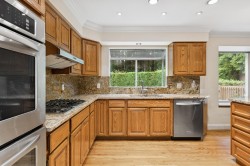 Spacious 4-bed, 4-bath Grouse Woods home with over 4,200 sq/ft across three levels, including a large basement with suite potential. A grand foyer with soaring ceilings and curved staircase opens to bright, generous rooms. The living room features a bay window and gas fireplace, while the dining room suits family gatherings. At the back, an open kitchen with oak cabinets, stone counters, stainless appliances, and large island flows to an eating area and family room with access to a private west-facing deck. Upstairs: 4 bedrooms, including a primary with walk-in closet and 5-piece ensuite. The lower level offers a rec room, wet bar, bath, and flex areas with separate entrances. Walk to Grouse Mountain, Grouse Grind, and trails. In Montroyal Elementary and Handsworth Secondary catchments.