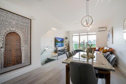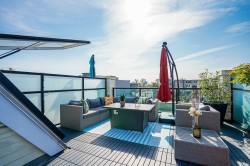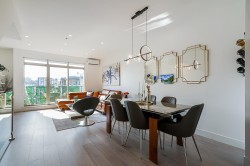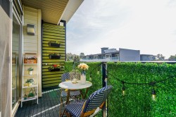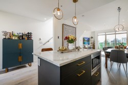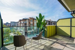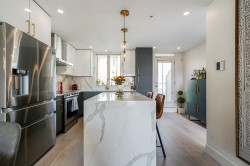 Stunning Renovated 2 bd/2bath Townhouse with 1,156Sqft of living space & 703Sqft of outdoor space including a Rooftop Terrace featuring 360 views of North Shore mountains & City Skylight. Functional reverse floorplan with spacious living space & good size bedrooms featuring a huge patio off the master bedroom. Bright South facing open concept living area perfect for entertaining. The renovations include dream Kitchen with Quartz countertops, custom cabinets & Samsung appliances including an air fryer oven, Twin cooling fridge with beverage drawer & built in microwave. High quality laminate floors, modern light fixtures/pot lights, Brilliant smart home control, Mysa smart thermostats, Kasa light switches, updated washer/dryer & split AC on top floor. Roof replacement currently underway.