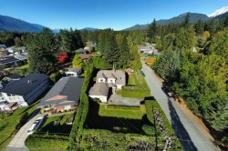 One of a kind, custom Brackendale home on a large, private corner lot framed by mature hedges. Enjoy the hot tub under a covered gazebo, peaceful garden pond, and all-day sun as it moves across the yard. A double garage and lean-to shed offer plenty of space for toys and storage. Inside, a stunning stone wood fireplace anchors the living room with mezzanine, complemented by a gas fireplace, solid oak floors, shaker doors, and board-and-batten detailing. Two bedrooms and one bath up, plus two bedrooms and two baths down. A warm, character-filled home in the heart of Brackendale — a true must-see.