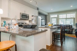 Uptown complex townhouse, 3 bedrooms upstairs, 2 bthrms, laundry, the main floor features your great room concept w/lvg rm, dng rm, kitchen, then family room w/access to your balcony deck. Plus a powder room! Family room boosts bi custom shelving/tile nook & electric f/p. Kitchen has white cabinets, s/s appliances and a big breakfast bar. Then the basement has a large foyer, garage w/room w/access to your fenced backyard.