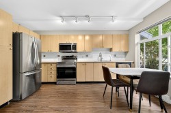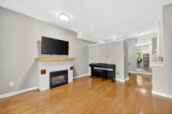 Welcome to Sundance! Ideally situated in a quiet part of the complex with a convenient South Surrey location. The North-facing kitchen overlooks a fenced yard, while the main floor offers solid hardwood flooring, a cozy fireplace, and a sunny South-facing balcony. Upstairs you'll find a spacious primary bedroom, a second bedroom, and a full bath. The lower level features a generous rec room with sliding door access to the yard—perfect for a third bedroom or office. Rough-in plumbing offers the potential for an additional bathroom. Includes a single garage plus covered carport for extra parking.