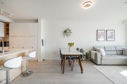 Discover this stunning 1-bedroom + den home offering 693 sqft of bright west-facing living space.The open concept layout features sleek laminate flooring, quartz countertops, and stainless steel appliances. A spacious den adds versatility for a home office or guest space. This unit includes 1 parking stall and 1 storage locker for your convenience. Enjoy an array of modern amenities, including an outdoor BBQ area, social lounge, fitness centre, and calming yoga studio--perfect for both entertaining and unwinding.