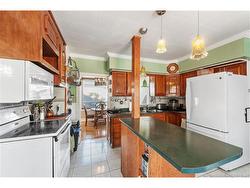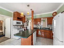 Spacious 2 story home sits on an R3-zoned lot and offers flexible living options. The main floor includes a living room, dining room, eat-in kitchen, a laundry area, and a sizeable primary bedroom that opens onto a private deck. There’s also a front sun porch and a rear porch leading to a 19 × 21 ft garage. Upstairs, a second living space includes another kitchen, two bedrooms, a living room, dining room, and a full bath. Add a wall and this area could function as a three-bedroom in-law suite. The unfinished basement, accessible from both the main house and the garage, includes a second laundry setup and offers lots of storage space. The home features a metal roof and a paved driveway that can accommodate three cars, and there’s a small fenced area in the backyard. The property is sold as-is.