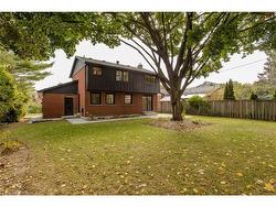 Modern luxury and family-friendly living in this fully renovated home in Dynes. Nestled on a mature, pool-sized lot with mature trees, this home is mins from schools, parks, dining, transit, hwys & lakefront. Spanning 2,177SF of total finished living space, this open-concept layout features exquisite details at every turn. From the stunning curb appeal with refinished exterior, fiberglass entry door & cedar-roofed covered porch, to the engineered white oak floors and abundant LED pot lights, this home has it all. The custom kitchen is a dream with slim-shaker cabinets, quartz counters & matching slab backsplash, gold fixtures, pantry, appliance garage & spacious island with breakfast bar. Seamless flow from kitchen to dining area with black frame sliders opening to a private yard with stone patio—ideal for entertaining. The inviting living room features a striking gas fireplace with modern surround & mantle. Plus an oversized window for natural light. Upstairs, retreat to a luxurious primary suite with WI closet & spa-like ensuite with freestanding tub & Riobel tub filler, large glass shower & double vanity. 2 additional bedrooms and a full bath complete this level. The finished lower level incl a cozy family room, office, massive laundry room with custom storage cabinetry & quartz counters. Extras: EV charger rough-in, gas BBQ connection, new Ridley windows, updated HVAC, sump pump, new electrical & much more! See supplement. All work done with permits. Move in ready!