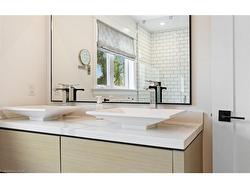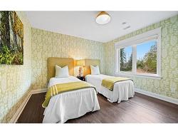 Stunning custom home on a 63' x 136' lot in downtown Burlington. Professionally landscaped yard with heated pool and detached year-round living space, ideal as a nanny suite, office, or guest house—includes kitchenette, 3-pc bath, and cozy lounge. Inside features coffered ceilings, 8" hand-scribed hardwood, custom millwork, and gourmet kitchen with quartz counters, bold blue island, premium appliances, and coffee bar. French doors open to a covered deck with sunken hot tub. Family room with wood-burning fireplace. Luxurious primary suite with spa-like ensuite and custom dressing room. Three additional bedrooms and stylish 4-pc bath upstairs. Finished lower level with rec room, 2-pc bath, and laundry/wet bar with granite and full-size fridge.