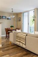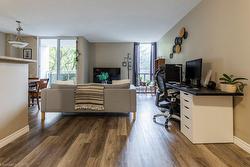 Welcome home to this bright, spacious one-bedroom condo, all set for you to move in! The open-concept layout is thoughtfully renovated, featuring ceramic and high-quality laminate flooring for a modern feel. The kitchen boasts updated cabinetry, stainless steel appliances, granite countertops, and a stylish patterned tile backsplash, complete with a breakfast bar for easy dining. The dining area flows seamlessly to a sunny balcony overlooking a wooded trail and scenic escarpment views. The bathroom has been updated with a sleek vanity and fully tiled bath and shower. The bedroom offers plenty of natural light through a floor-to-ceiling window and includes a roomy closet. In-suite laundry hookups add extra convenience. Enjoy a pet-friendly building with low fees that include heat, water, and more, plus your own parking space and storage locker. With walking trails, parks, and unbeatable proximity to shopping, transit, and highway access, this is an ideal spot for first-time buyers or downsizers alike!