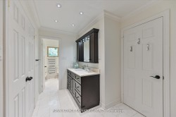 Backing on a meadering creek, soaring magestic trees and nature trails that seamlessly blend nature and urban living, there is something special about this home. Located in an exclusive enclave off coveted Mississauga Road and Sawmill Valley Neighbourhood. Stepping into the foyer, you are greeted by the spectacular imported English Oak staircase and the warm embrace of this beautiful home. From the luxurious Hickory floors on the main and second floor, to the soaring ceilings, and beautiful chandelier, the attention to detail in this home is surpassed by few others. The main floor highlights versatility in living spaces. Hosting gatherings, enjoying family time, and work from home. The spacious main floor office can be adapted to a bedroom as the main floor also boasts a 4 piece full bath, and laundry with towel warmer .Step out to the elevated deck to bbq, off the kitchen or enjoy a cup of coffee and overlook the majestic trees , the serene meditation rock and hear the water gurgling along the creek backing onto to the property. The second floor boasts 3 large Bedrooms, a renovated main bath and an exceptional Primary suite with a fully renovated dressing area, 5 piece bath, walk in closet, sitting area, and studio ensuite overlooking the main floor. This ensuite space can be used as a reading area, yoga, office or homework space. The possibilites are yours to imagine and define when you make this home your own. The lower level features a second suite with a 6 piece ensuite again with bidet, walkout to the back garden deck, a play area, and a second 3 piece bath off the recreation room.4 Bedrooms plus full guest suite, main floor office, 4000 sq ft of living space, immaculately maintained home, backing onto Sawmill Creek and Trail system. Roof (7 years), 200 amp service, HVAC 2025 Furnace, Gentek Regency Windows 2013 (lifetime warranty), New eaves and downspouts, Features too many to mention. Rarely offered home of this quality.
